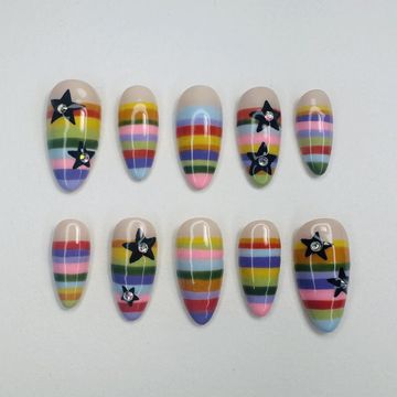 A hand painted set of colorful rainbow striped press-on nails with star embellishments.
